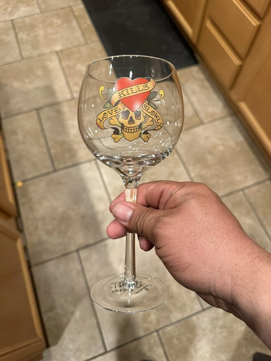 Classic Ed Hardy 034 Love Kills Slowly 034 Heart Amp Skull 8 5 034 Wine Glass Ebay